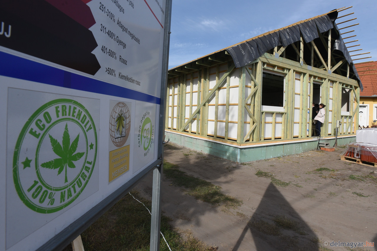 Bemutatóra hívta az érdeklődőket szombaton egy kenderbetonból épülő házhoz a szegedi KÖSZI Trade Szövetkezet. Horesnyik Béla, a kenderprojekt vezetője előbb elmagyarázta, majd megmutatta, egyszerűen és gyorsan halad a falazás. Öt ember öt tízórás munkanap alatt felhúzhatja egy családi ház falait, még ha közben zsaluz is. Ez Domaszéken már a második ház, ami ilyen környezetbarát technológiával készül. Az elsőt lakják, ez volt az országban is a legelső. A másodikat bemutatóépületnek szánják.